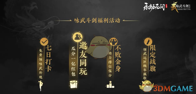2、12月5日起,永劫无间手游端内将开启咏武斗剑限时活动。每日签到即可领取胡桃专属咏武外观、瑞霖宝箱、神州宝炉等奖励。