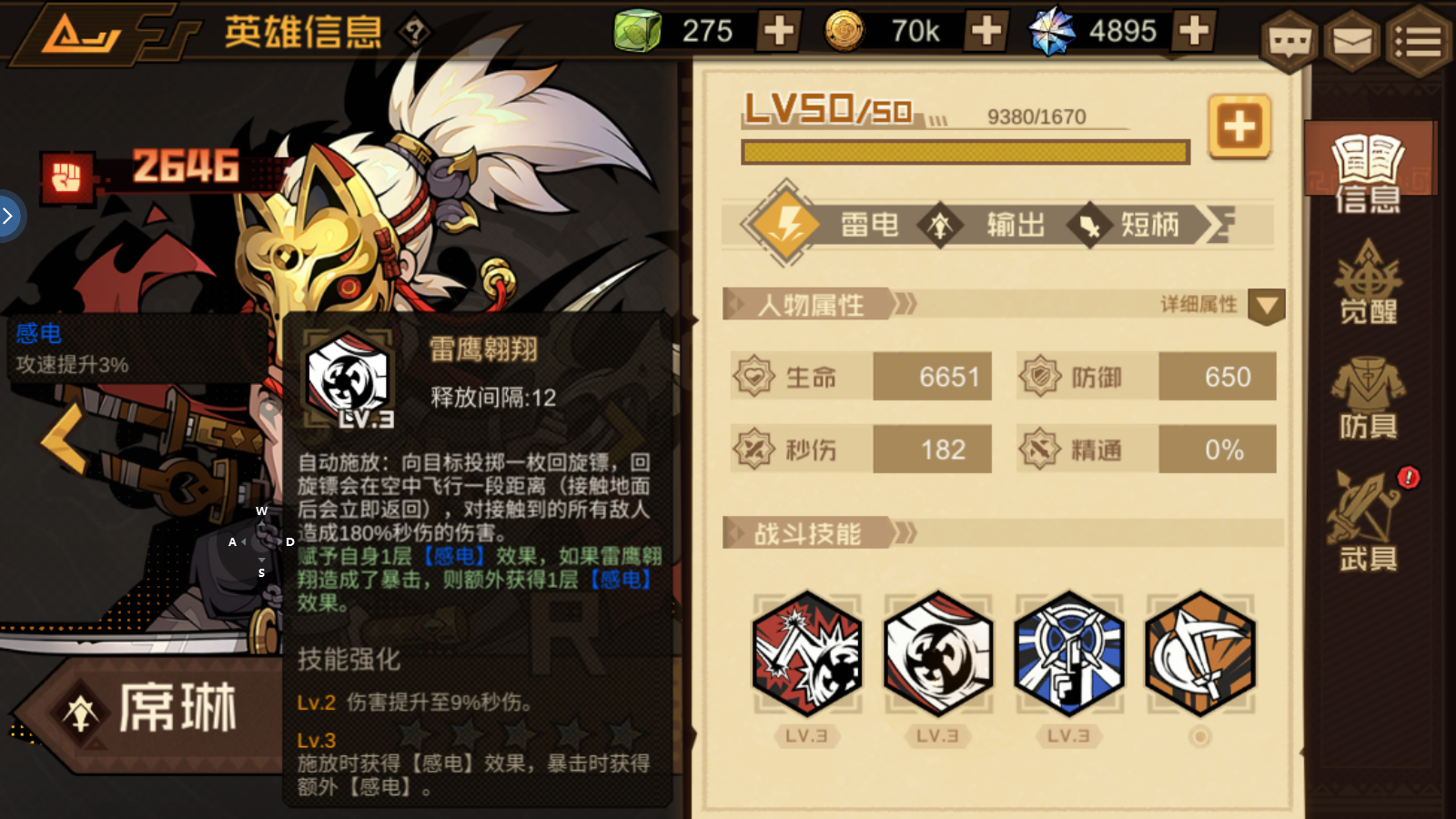 技能强化:Lv.2 伤害提升至9%秒伤;Lv.3 施放时获得【感电】效果,暴击时获得额外【感电】