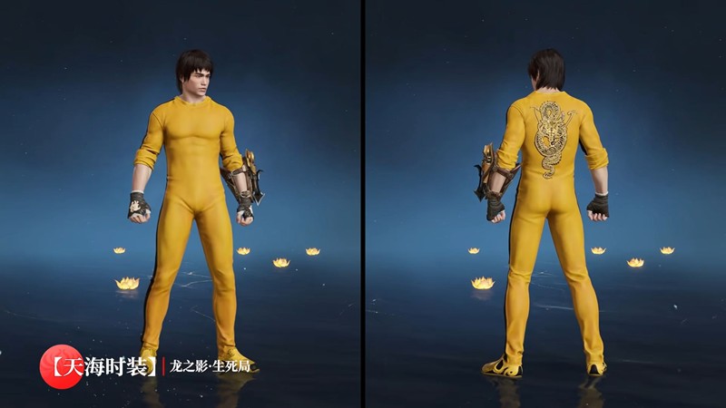天海-龙之影·生死局:经典的黄色练功服,背后有大面积中国龙刺绣,与拳套上的“龍”字相呼应。