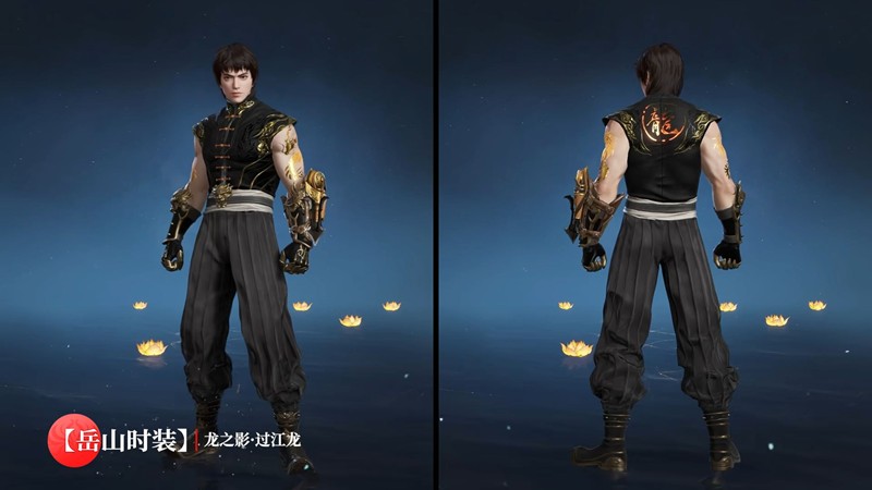 岳山-龙之影·过江龙:立领无袖短褂搭配盘扣,饰有金色龙纹与兽首腰带,尽显硬朗霸气。