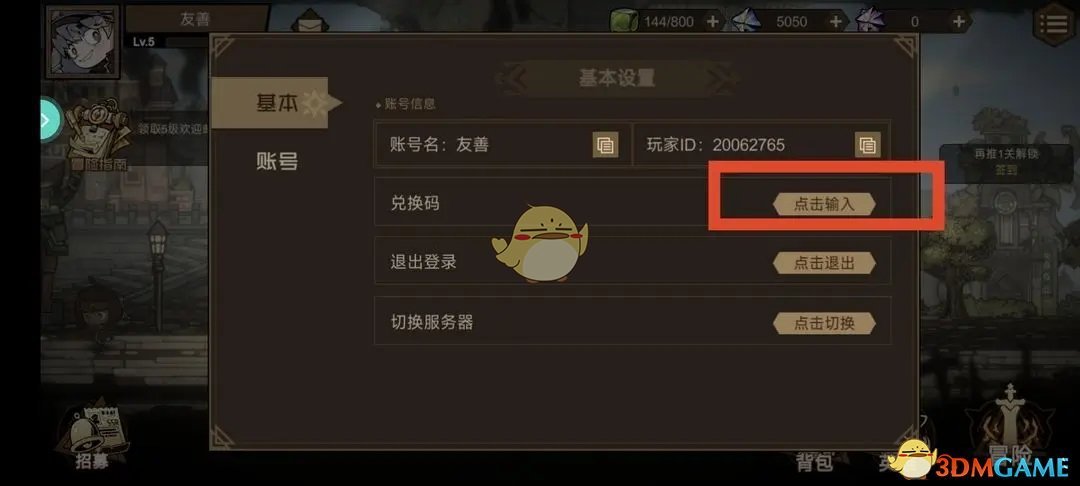 3、在设置而已嘛,找到兑换码,点击输入后,输入兑换码点击兑换;