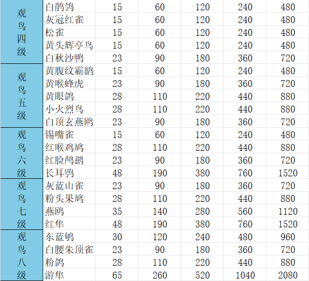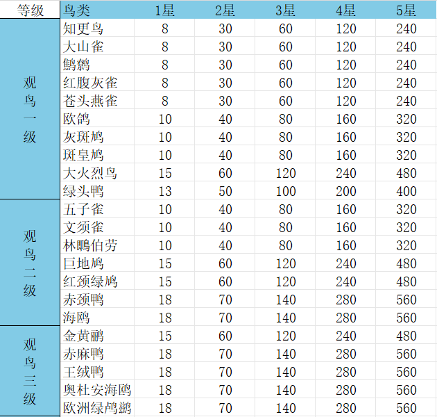 以上就是小编整理带来的《心动小镇手游》观鸟1-8级价格表,更多精彩内容,请点击关注易采游戏网,小编将持续为您更新!