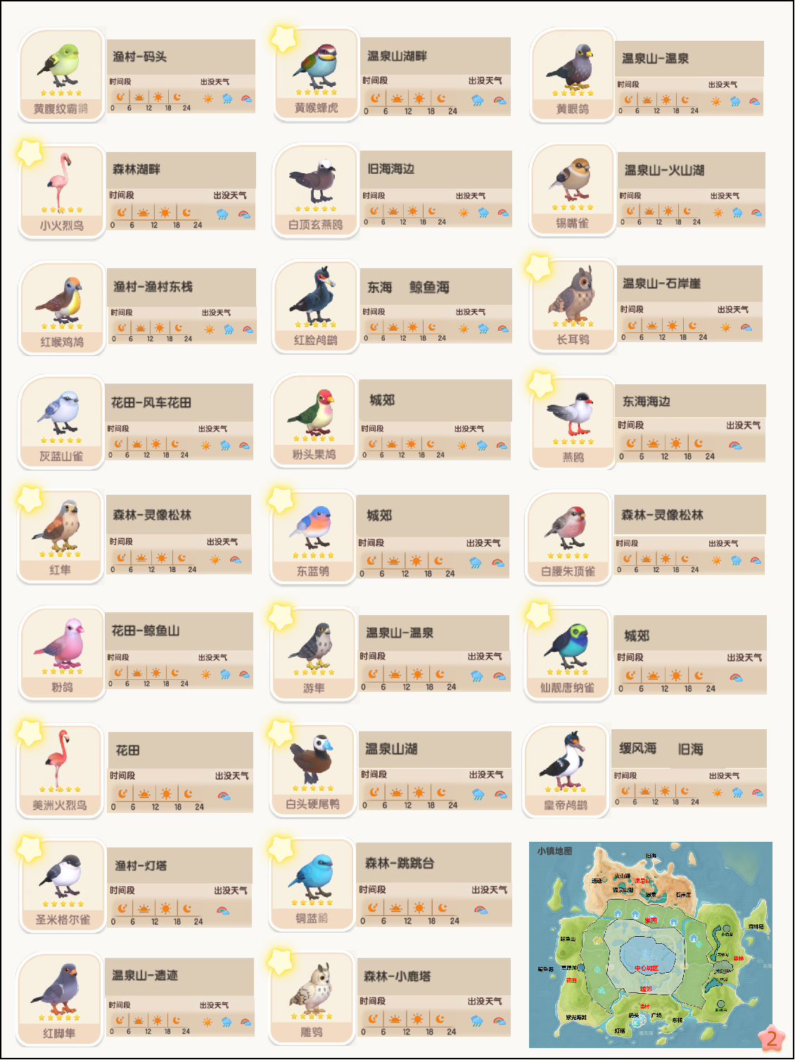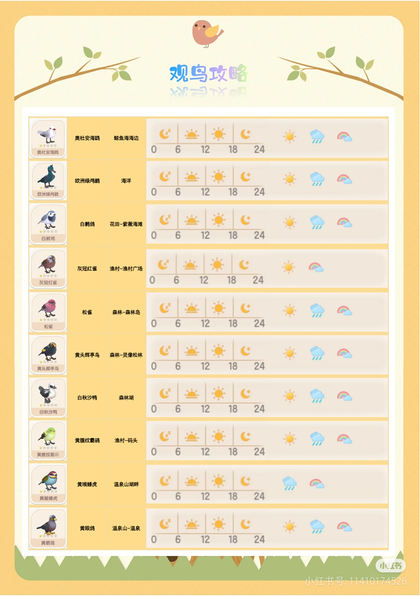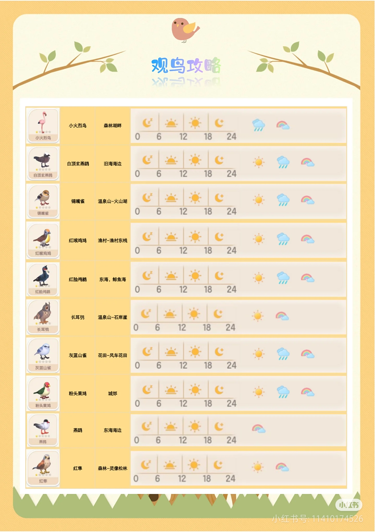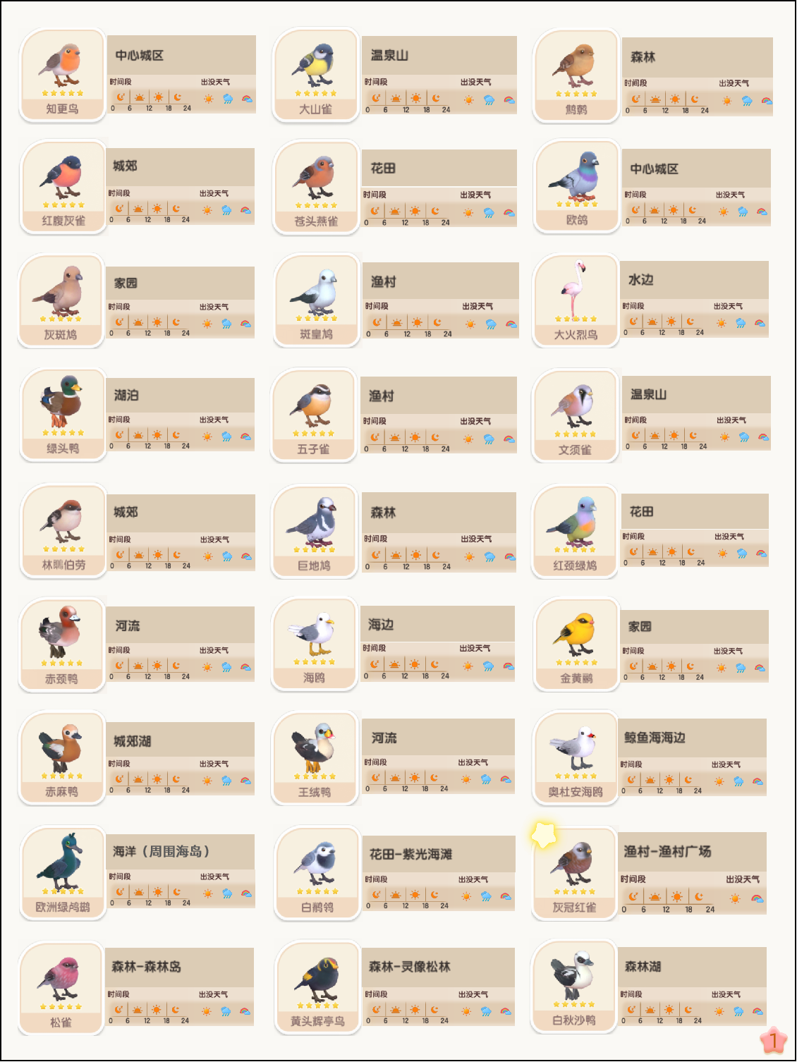 鸟基本全是全天段出现,部分鸟对应天气才会出现,左上角有小星星的,就是有天气限制的鸟,大家稍微注意下哦;