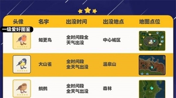 1、大山雀常出没于温泉山地区,玩家可以使用游戏中的定位工具来确认刷新的位置,建议提前前往对应地点等待。