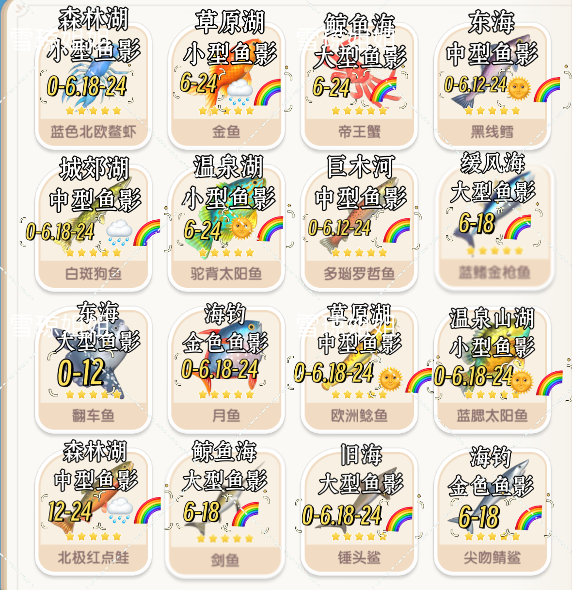 3.鱼尾最好是用出在小号身上的一周能买110个,用3个鱼尾等他鱼浪结束,这样水面9只鱼,再保持距离丢一个鱼尾,这样圈子里第三个鱼开始下沉,你要长按等待自己需要的鱼影,一看到鱼影一秒做反应扔杆,把他钓上来,比较考验反应能力但可以让大号不用星星买香水怼了。多的星星可以刷图鉴去了!
