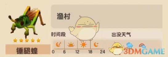 心动小镇锤腿蝗只会出现在渔村任何时间和任何天气都可以捉到,捕捉媒介是灌木丛、铁质长花坛、芦苇和地面,刷新时间很快,只有一分钟,警戒时间只有10秒钟,还没有找到锤腿蝗的小伙伴可以参考小编整理的《心动小镇》捶腿蝗快速捕捉位置和时间攻略,相信大家看完之后一定可以快速收集并丰富自己的图鉴。