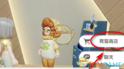 2、在对话页面选择育猫商店进入,在物品栏中找到猫粮,点击进入购买页面。