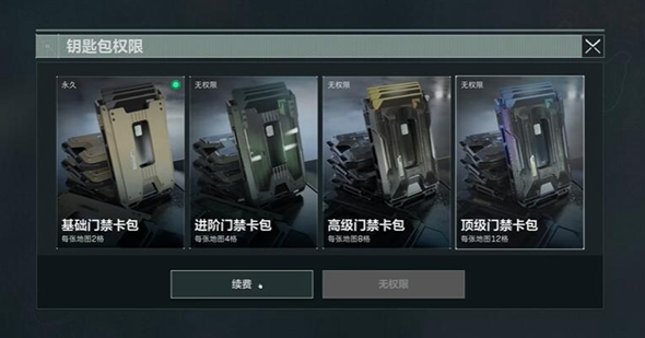 1、进入钥匙包权限界面,点击后面两个门禁卡包,再点击续费。