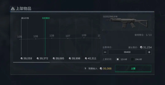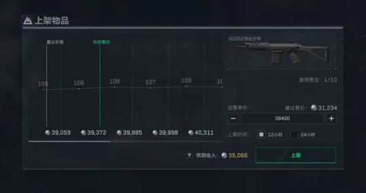 2、在交易市场的左侧销售区域,挑选出打算出售的武器或装备进行上架。