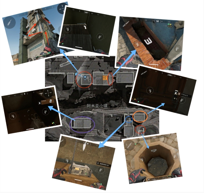 2、在阿米娅小镇,红圈标出的地点分散着三个密码,它们位于顶楼、花坛以及井口。随后,前往蓝圈所示位置启动密码门,进而进入地洞接受任务。再前往紫圈地点安装C4,待爆炸发生后,上至二楼深处,沙发旁即可找到一张门卡。持此卡至橙圈标识的房屋内,便可开启第二个协议箱。