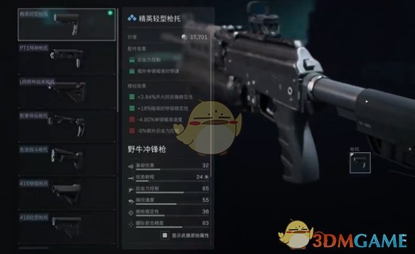 4、枪托:精英轻型枪托,为后座力控制和额外举镜瞄准时移速的增加,可以减轻重量,提高机动性。