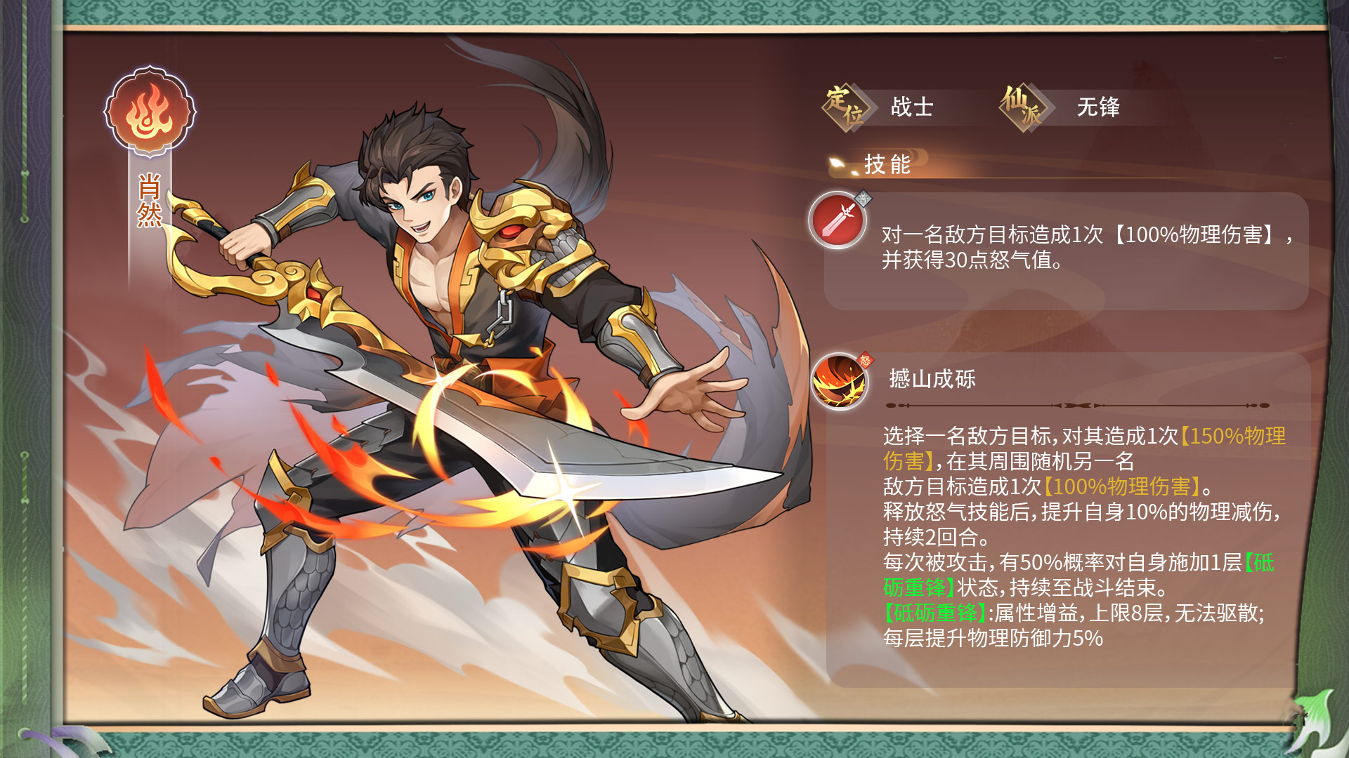 纵横旅人游戏中肖然的定位是火属性的战士,来自于仙派无锋。西沙国护国神将肖羽的独子。为追随父亲的脚步而拜入仙派无锋,后又参军在战场上磨砺。刀法出神入化,为人正直,言出必践。接下来给大家带来了《纵横旅人》肖然技能图鉴,包含该伙伴角色的立绘背景技能以及秘法推荐介绍,一起来看看吧!