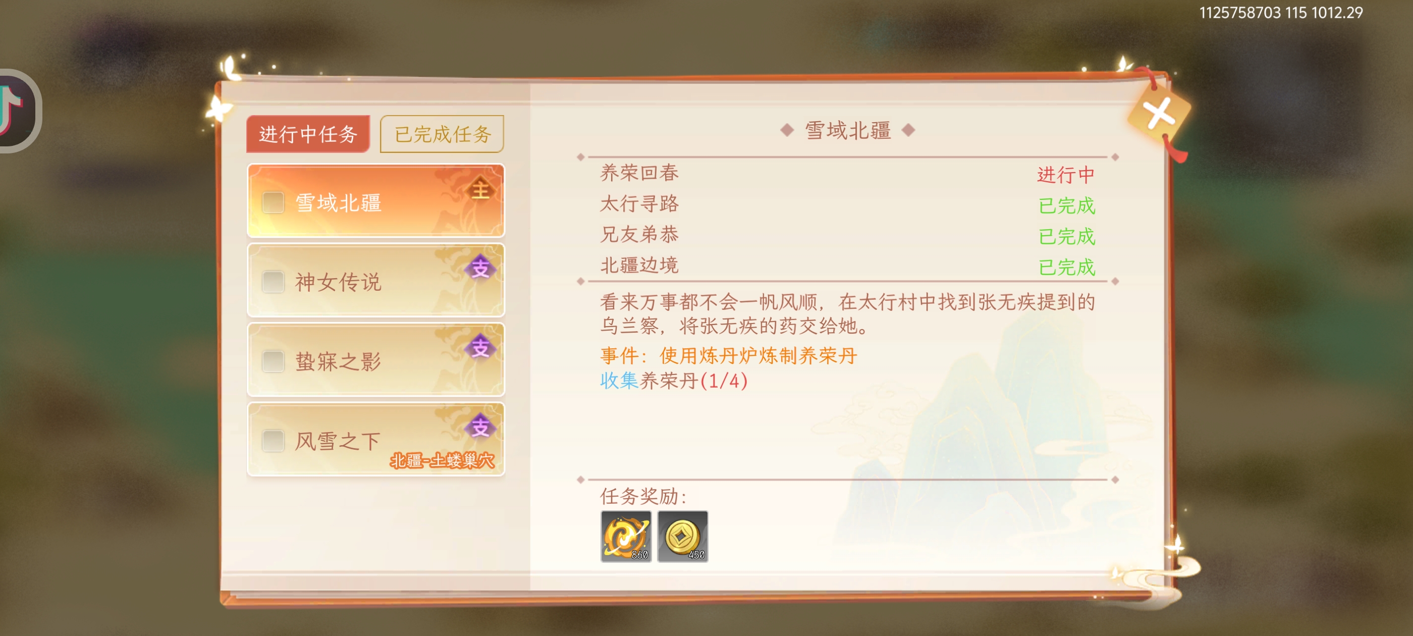 主线雪域北疆-养荣回春,需要4份养荣丹