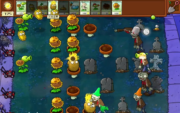 4、阳光向日葵造了一列之后,我们就可以开始建造输出植物了,推荐建造冰香蒲,期间花盆菇和土豆雷,一有就去放。
