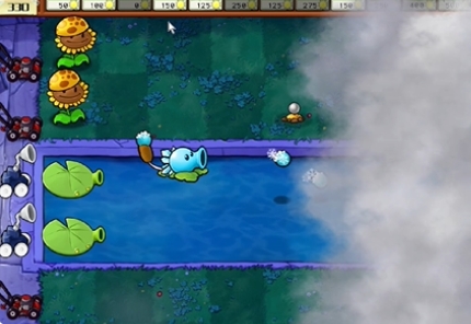 2、先在右侧种植两个阳光向日葵和两个豌豆睡莲,在泳池中种植一个寒冰香蒲。