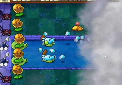 4、然后在右侧补充一排阳光向日葵和一排冰冻西瓜大喷菇,在泳池中种植两个豌豆荚许愿池和两个海兵高坚菇。