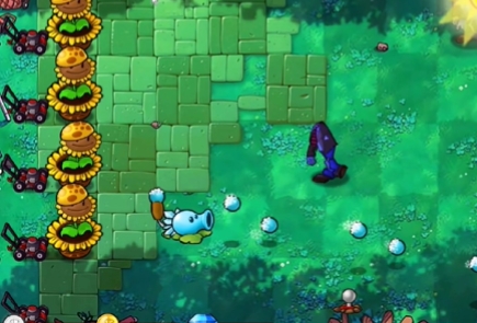 2、先在左侧种植一列向日葵花盆,在花盆上种植阳光向日葵,在下方种植一个寒冰香蒲。