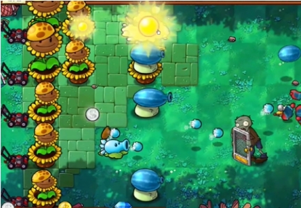 4、然后补充右侧的冰冻西瓜大喷菇,在上方分别种植一个磁力坚果和阳光土豆雷。