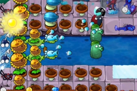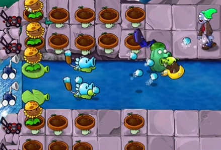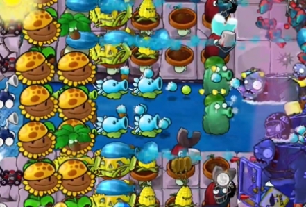 2、先在左侧种植4个阳光向日葵,在泳池中种植两个寒冰香蒲。