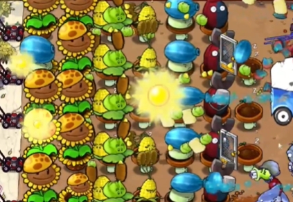 2、在最左侧种植一列向日葵花盆和阳光向日葵,在第三列中间种植两个玉米卷香蒲。