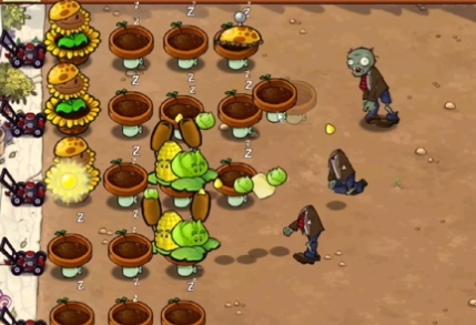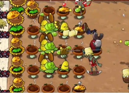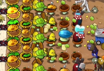 3、在中间一列补充玉米卷香蒲,在最右侧提前种植几个阳光土豆雷。