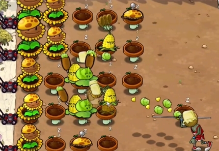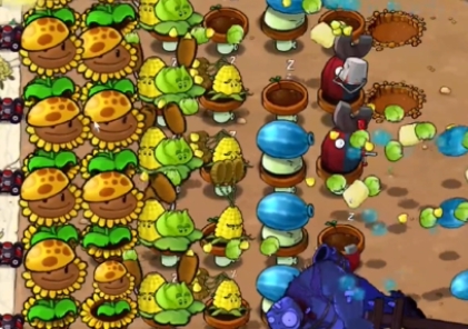 4、然后补充中间的玉米卷香蒲和三行玉米投手,在右侧种植一列冰冻西瓜大喷菇。