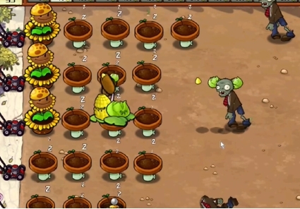 2、先在最左侧种植一列向日葵花盆和阳光向日葵,在第三列中间种植一个玉米卷香蒲。