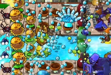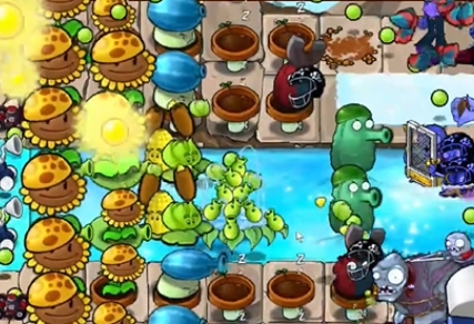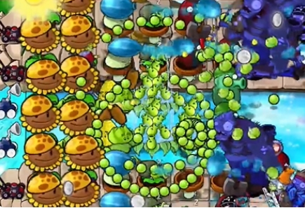 4、然后在向日葵右侧种植一列冰冻西瓜大喷菇,在泳池中种植一个豌豆荚许愿池。
