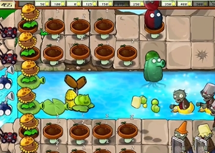 2、先在左侧种一列阳光向日葵,在泳池中种植一个玉米卷香蒲和一个高兵菇。