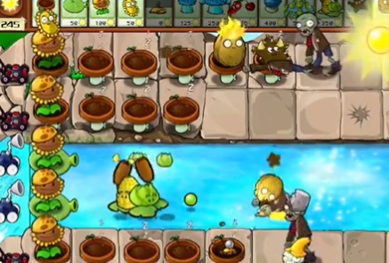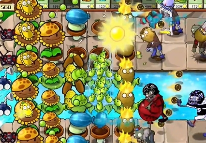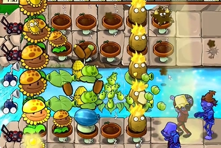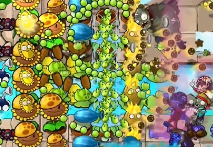 3、然后在左侧补充第二列向日葵,在第五列种植一列火炬坚果,在泳池中补充玉米卷香蒲和豌豆荚许愿池。
