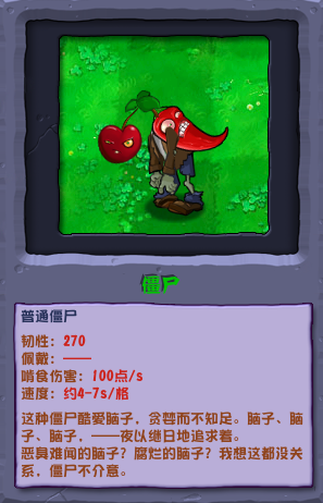 普通僵尸,死亡一瞬间自爆,炸毁身边的植物,僵尸不会受到伤害。