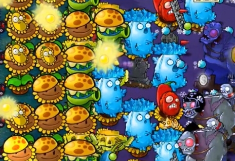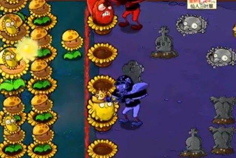4、继续在左侧补充一列阳光向日葵,在右侧种植一个寒冰豌豆坚果进行输出。