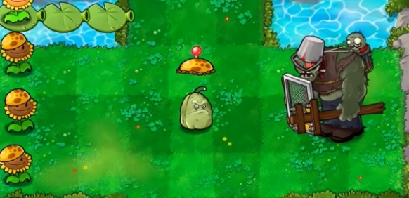 2、先在左侧种植一列阳光向日葵,在巨人僵尸前面种植一个窝瓜。