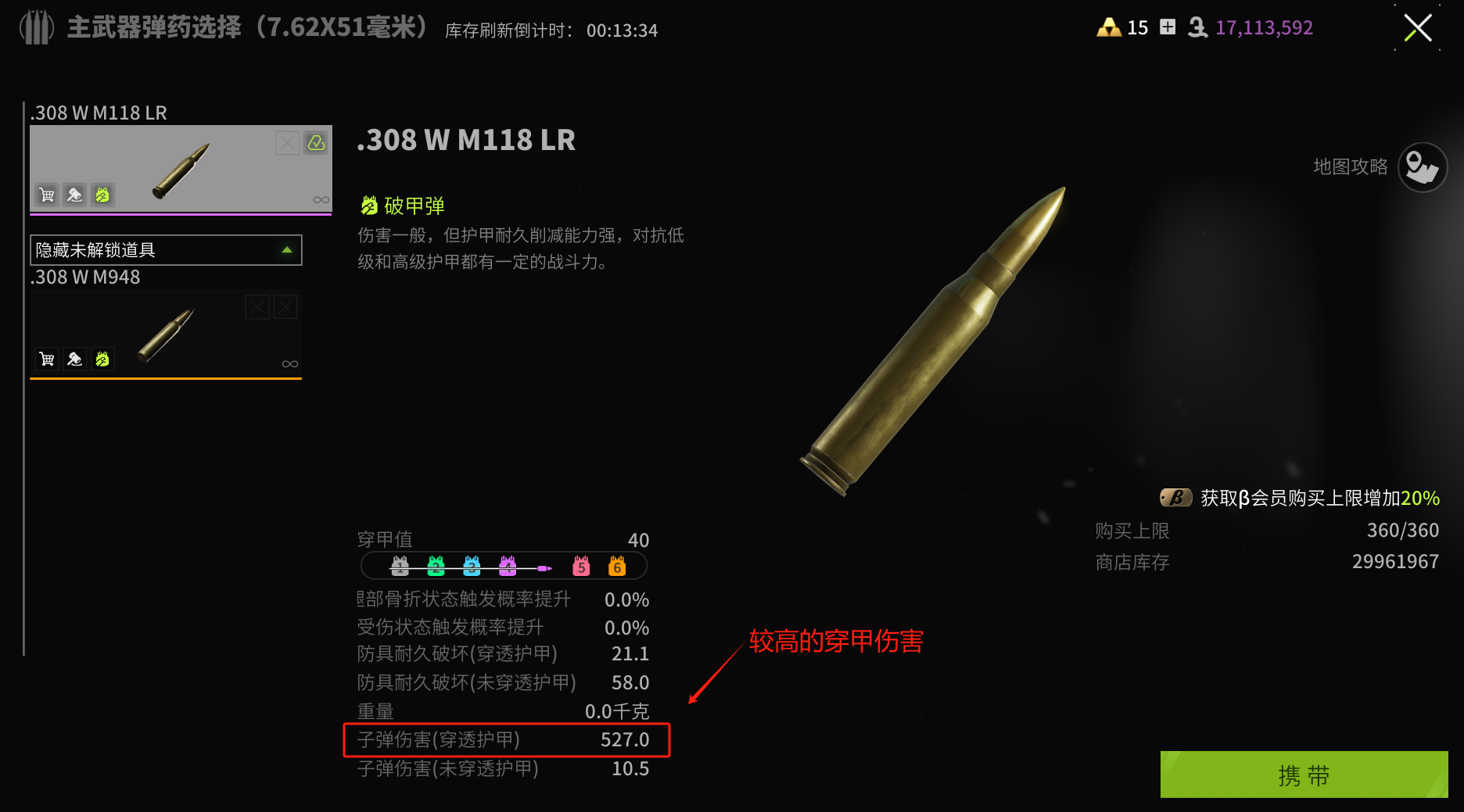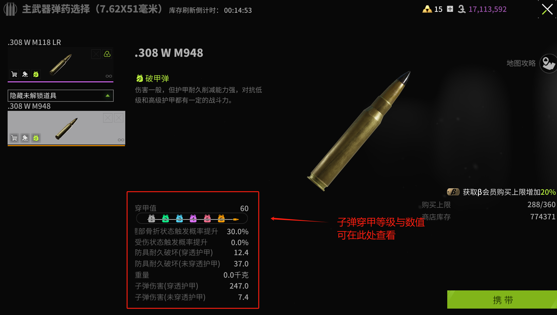 以.308 W M子弹为例,四级穿甲子弹伤害为527,六级穿甲子弹伤害为247,所以在玩DR-10冲锋狙时我们会选择4级穿甲弹。