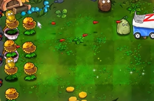 2、先在左侧种植两列阳光向日葵,使用窝瓜击败雪橇僵尸。