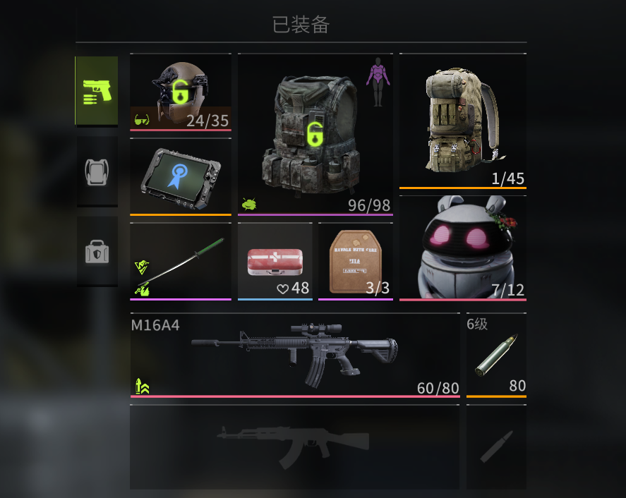 护具携带什么都可以,并不重要,武器选择趁手的即可,但子弹破甲等级至少为5级,则可轻易穿透boss的护具,这里需要注意,枪械是我们输出的主要手段,因此子弹等级非常重要。既然没有危险,金字塔PVE中背包我们选择最大的曼巴背包即可。
