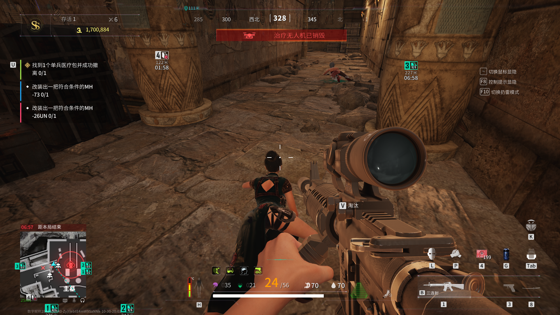 打无人机和女boss都推荐上二楼来拉扯,通过不断探头来保证自身的安全。射击女boss时需要注意无人机一定要处于瘫痪或者被击落的状态。此外二楼还有一个好处,就是非常容易命中头部,所以推荐瞄准头部来射击。