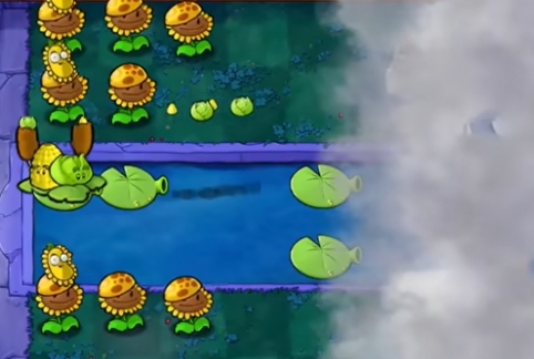 4、补充草坪和泳池中的向日葵和阳光咖啡豆,在草坪左侧第三列种植一列寒冰豌豆坚果。