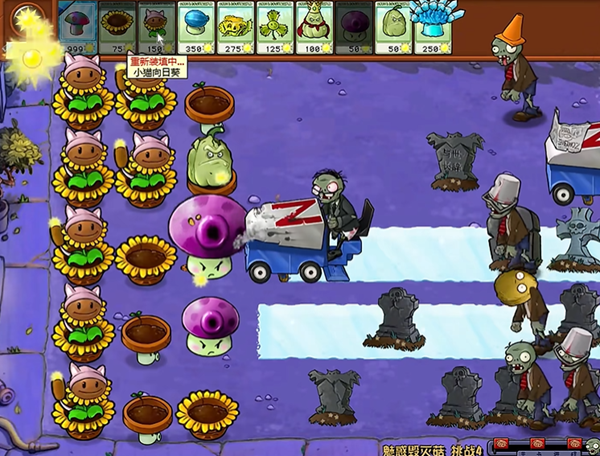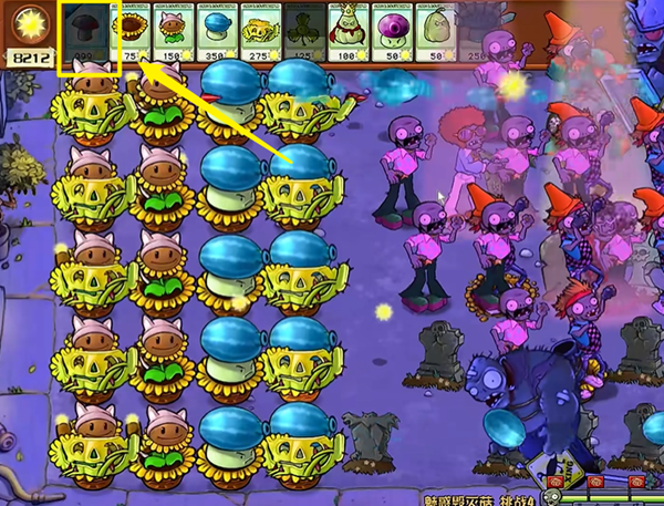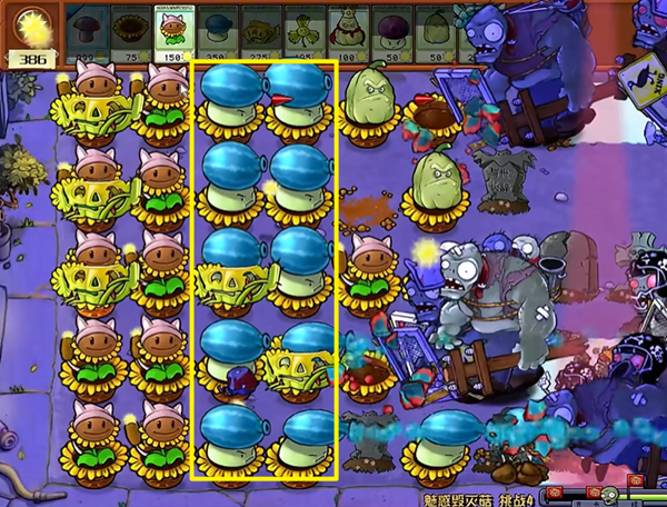 1、开局我们用弹弹菇拖住冰车,在被顶住的期间,我们的香蒲向日葵可以打掉他。
