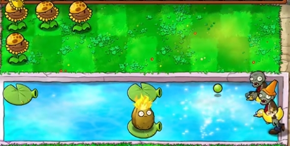 5、最后在左侧种植一列机枪豌豆香蒲,并在第四列种植一列冰炬木桩即可。