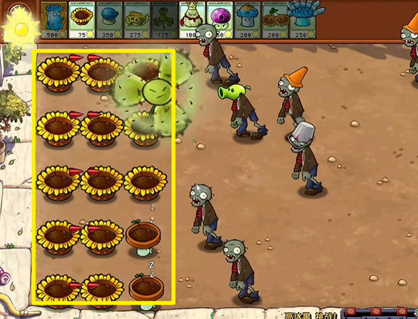 1、用最快速度建造三列的向日葵花盆,确保能在大量僵尸出来之前放出吹风。