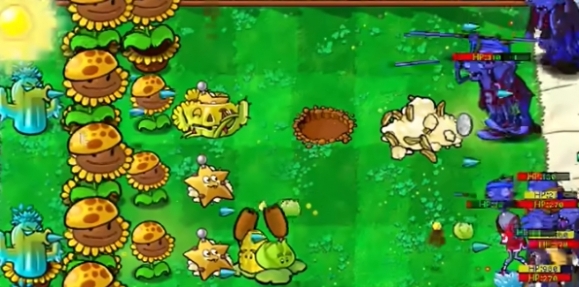 4、在向日葵的右侧补充一列土豆杨桃,根据情况使用寒冰豌豆菇。