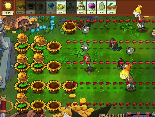 4、种植的毁灭加农炮需要打第一行和最后一行,这两行限制了格子,是最脆弱的。