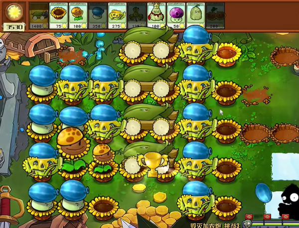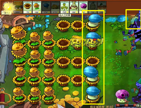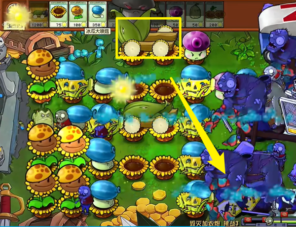 3、种植差不多3列的向日葵后,我们就开始放置输出植物,用冰瓜大喷菇和南瓜的组合。