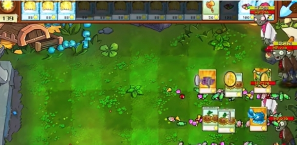 3、将刷出的植物种植在左侧,使用向日葵炸弹击败右侧的敌人。