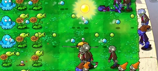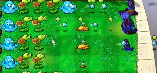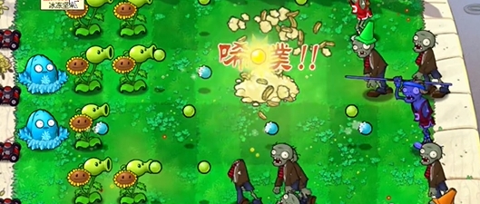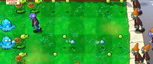 3、在左侧三路种植一个寒冰坚果,在下方种植一个豌豆向日葵。