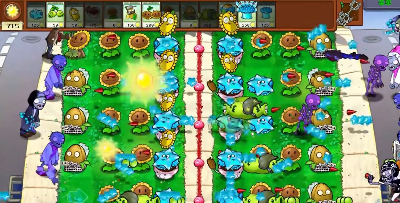 在打这一关的时候,还是要和原来打两面夹击的思路一样,以海杨桃作为主力输出。因为海杨桃这个植物虽然不能直接攻击前方的僵尸,但是它却可以向后方发射一枚带有减速效果的小杨桃。所以当地图上出现僵尸的时候,要把海杨桃种在地图的另一边,这样才可以对其进行输出。并且海杨桃还有一个特性,那就是每在地图上释放一次冰冻效果,那么海杨桃的子弹数量就会加一,并且这个子弹数的增加是作用在五个方向上的。所以除了海杨桃外,还要带上冰冻倭瓜、寒冰菇等具有全场冰冻效果的植物,用来辅助海杨桃。