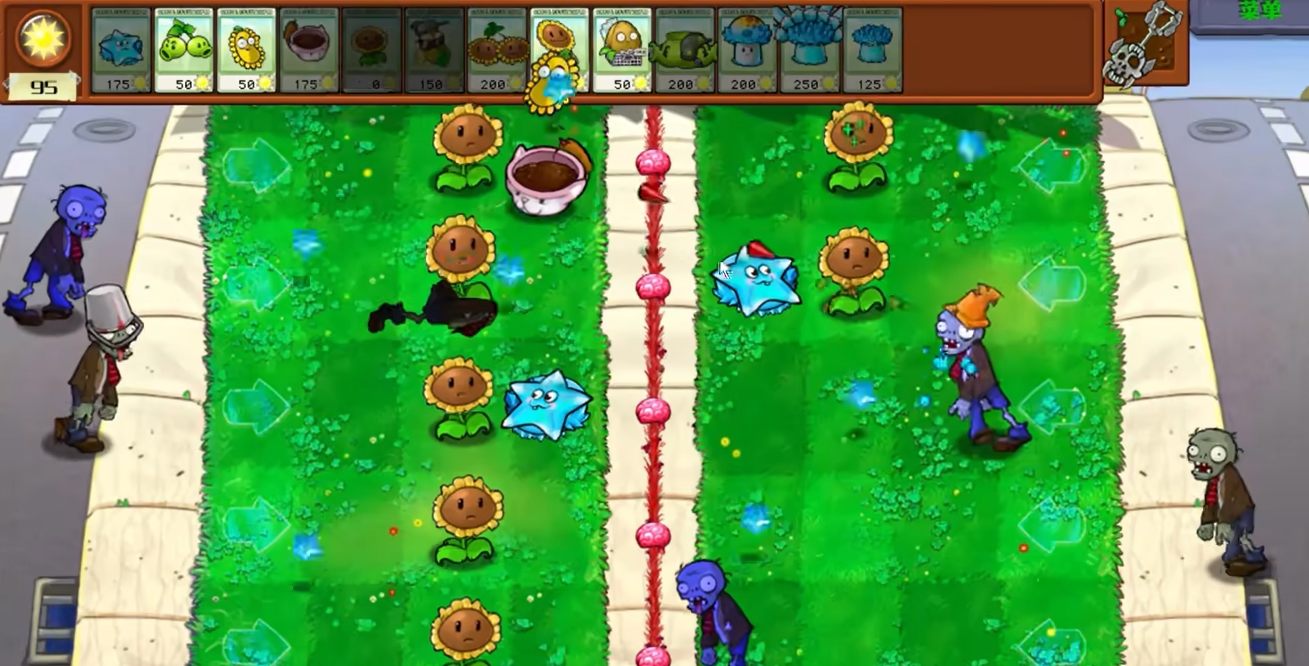 而阳光生产类植物可以带上向日葵和阳光豆,如果还是觉得缺少阳光的话,就再带上一个伪装向日葵。这植物不仅便宜,而且还能短暂的阻止僵尸前进。前期的海杨桃是非常弱的,建议大家带一个猫砂盆,用来补充输出。本关正式开始后,先在地图的后排种植向日葵和阳光豆。因为海杨桃比较便宜,所以一般只需要建造一列向日葵就够用了,而阳光豆因为不占用格子,所以可以无限种植。前期先用猫砂盆进行打工,有了阳光以后就开始在地图上布置海杨桃。这里,虽然冰冻类植物可以触发海杨桃的加成效果,但是在前期缺少资源的情况下最好不要乱用。毕竟它们都是救场植物,可以在前期很好的消灭血量较高的僵尸。