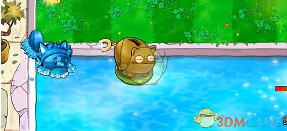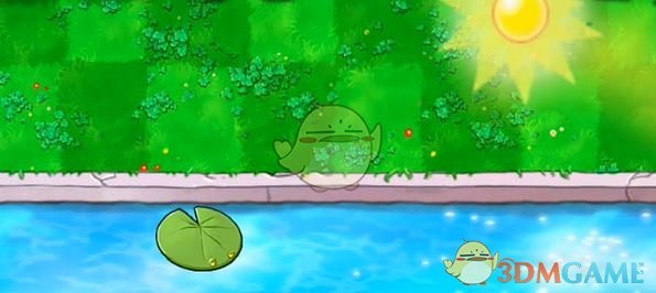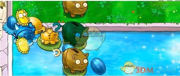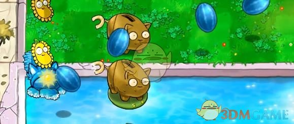 4、在豌豆睡莲上放一个坚果存钱罐,并在其后方放个冰瓜香蒲。