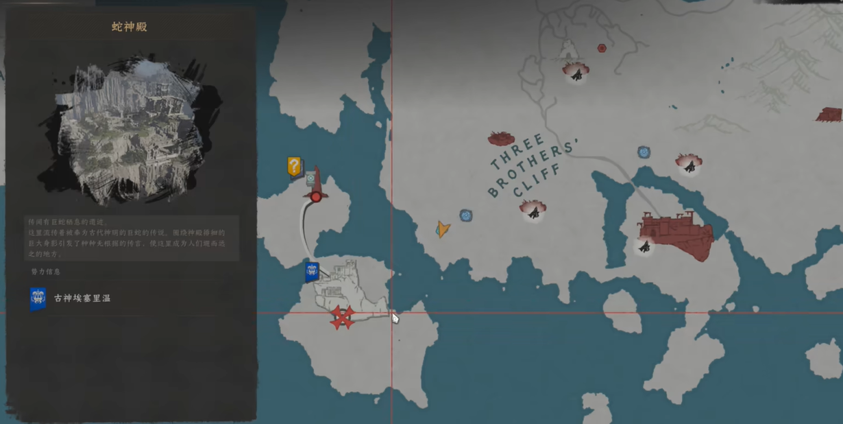 首先需要解锁蛇神殿区域,地图标注为蛇神殿,位于杜黑文领地,靠近 THREE BROTHERS' CLIFF 区域。建议激活蛇神殿附近的阿比斯痕迹传送点,方便后续往返收集素材。